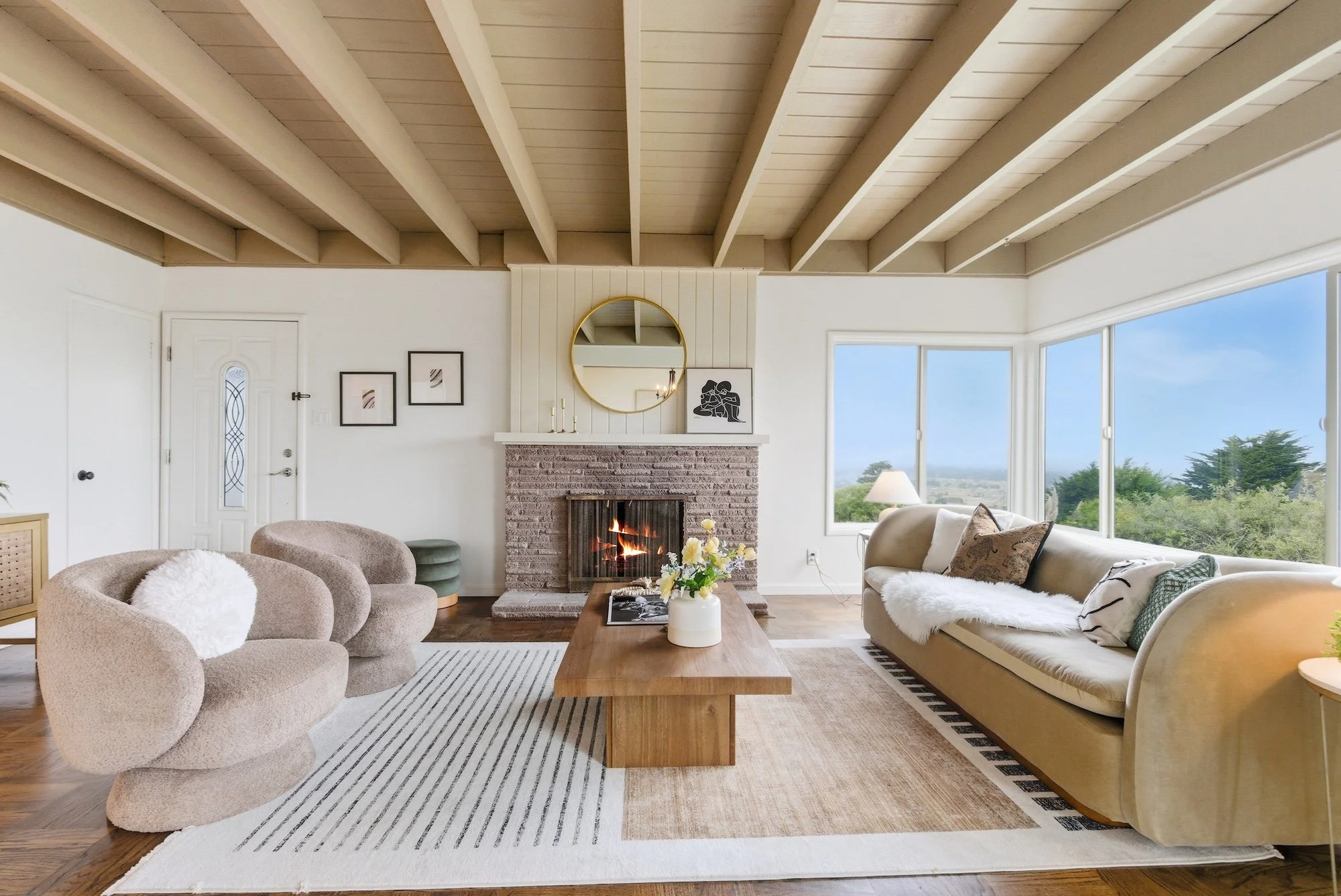 The spacious living room, complete with a cozy fireplace and picturesque windows, frames an iconic Bay Area panorama including the Pacific Ocean, the Golden Gate Bridge, and Sutro Tower. The adjacent dining room flows seamlessly into the all-new kitchen, featuring sleek quartz countertops, stainless steel appliances, and brand-new checker cabinets. The main level hosts two sun-filled bedrooms and an updated bathroom.